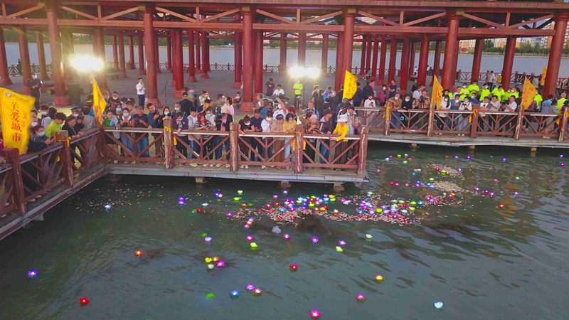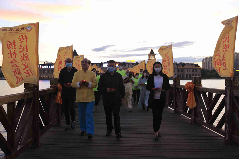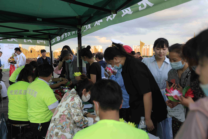 中元来临奠亲人,无比悲伤泪湿襟,三叩九拜在坟前,一盏荷灯表孝心。今天是中元节,天堂墓园董事长马鑫携全体员工于今天上午8:30分首先为安葬在天堂墓园的大庆公安英烈献花祭拜然后举行公祭活动,为所有安葬在天堂墓园内的逝者鞠躬合拜当晚6:30分,马鑫董事长带领天堂墓园所有工作人员及大庆殡葬协会同仁们来到黎明湖畔,为市民免费发放7000盏荷灯,以表对逝去亲人最文明,最绿色追思。很多逝者亲人手捧荷灯,含泪祈祷自已逝去亲人在天堂上空幸福安祥并连连称赞这一文明祭祀做法和万分感激此举活动期间,又为现场市民免费燃放烟花,寓意是:在市委、市政府领导下,大庆人民驱赶瘟神,战胜疫情,平安健康,幸福快乐。