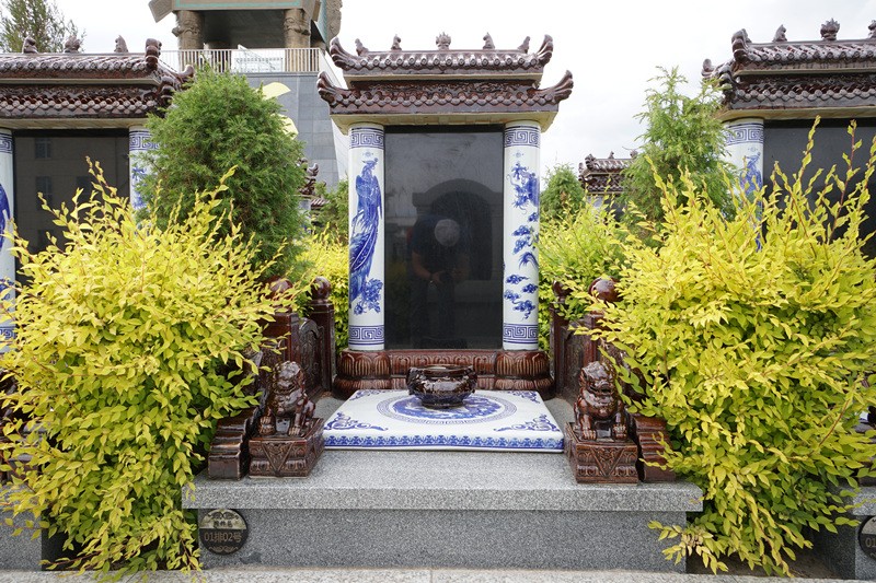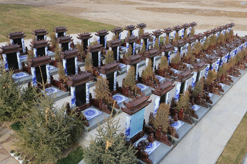 国粹苑苑区位临祈福大道,背靠四足方鼎,东侧有金龙护佑,是全园绿化率最高的苑区,碑型是景德镇景泰蓝陶瓷碑设计,碑帽上有吉祥瑞兽屹立,具有辟邪、聚财,福佑家族的寓意。